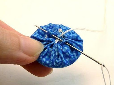 2) Marcar en la mitad de la marca primera o sea a los 1,5 cm todo el contorno del circulo y realizar una bastilla ( hilvanar) para luego tirar y que se frunza con el aro dentro.