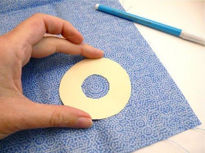 1) Colocar el aro sobre la tela del reves y marcar 3 cm del borde hacia afuera. Cortar.