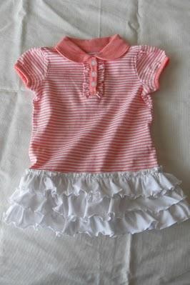 Se trata de realizar un vesitido para bebe de hasta 1 año, partiendo de la base de una camisetita y de un retazo de tela de jersey de algodon que es la tela de camisetas o un retazo de camiseta en desuso.