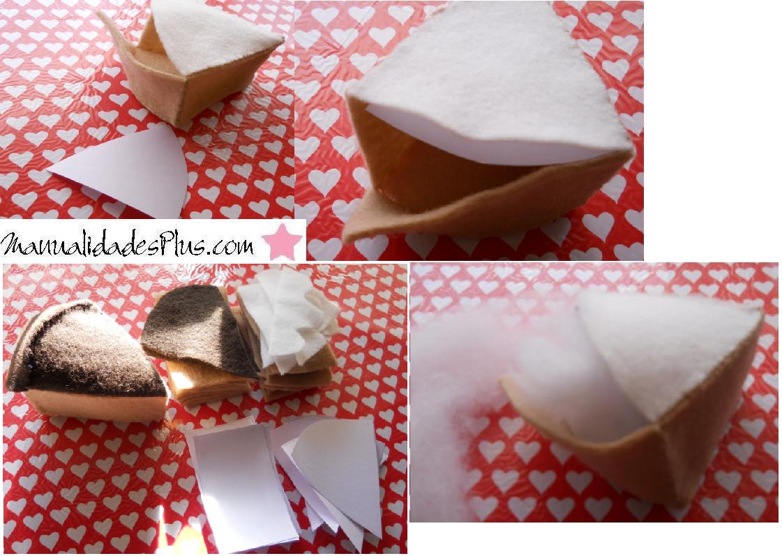 Luego cortar en cartulina 2 rectangulos y un triángulo para colocarlos en la base y laterales antes de rellenar con guata.