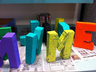 *Dibujar y recortar 2 veces cada letra ó las letras que se deseen, colocar y pegar con pistola silicona los vasos prásticos entre medio de cada carton.