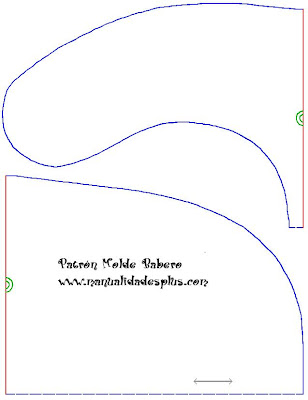 Patrón molde babero: Imprimir y recortar, luego unir juntando las 2 líneas rojas y los centros en verde. Este es la mitad del patron que se deberá cortar sobre una tela doblada.