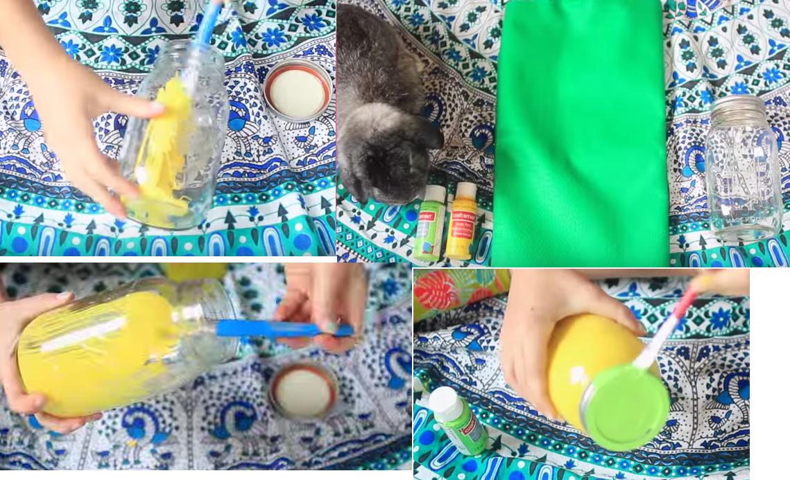 Colocar pintura amarilla dentro del frasco, lavado y seco. Con el pincel ayudarse para pintar las paredes del frasco. Dejar secar con la tapa abierta.