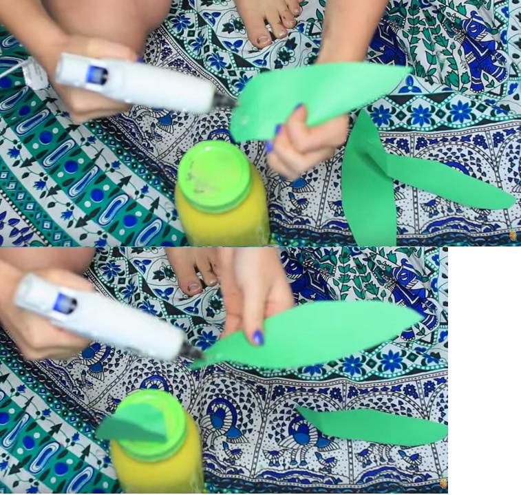 Ir pegando cada hoja sobre la tapa del frasco, doblando el extremo inferior de la hoja para tener superficie de pegado.
