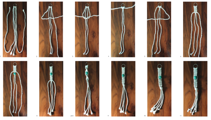 Para el llavero de macramé con rayas, se realizo con nudos de medio punto verticales e hilados de lana para hacer las rayas.