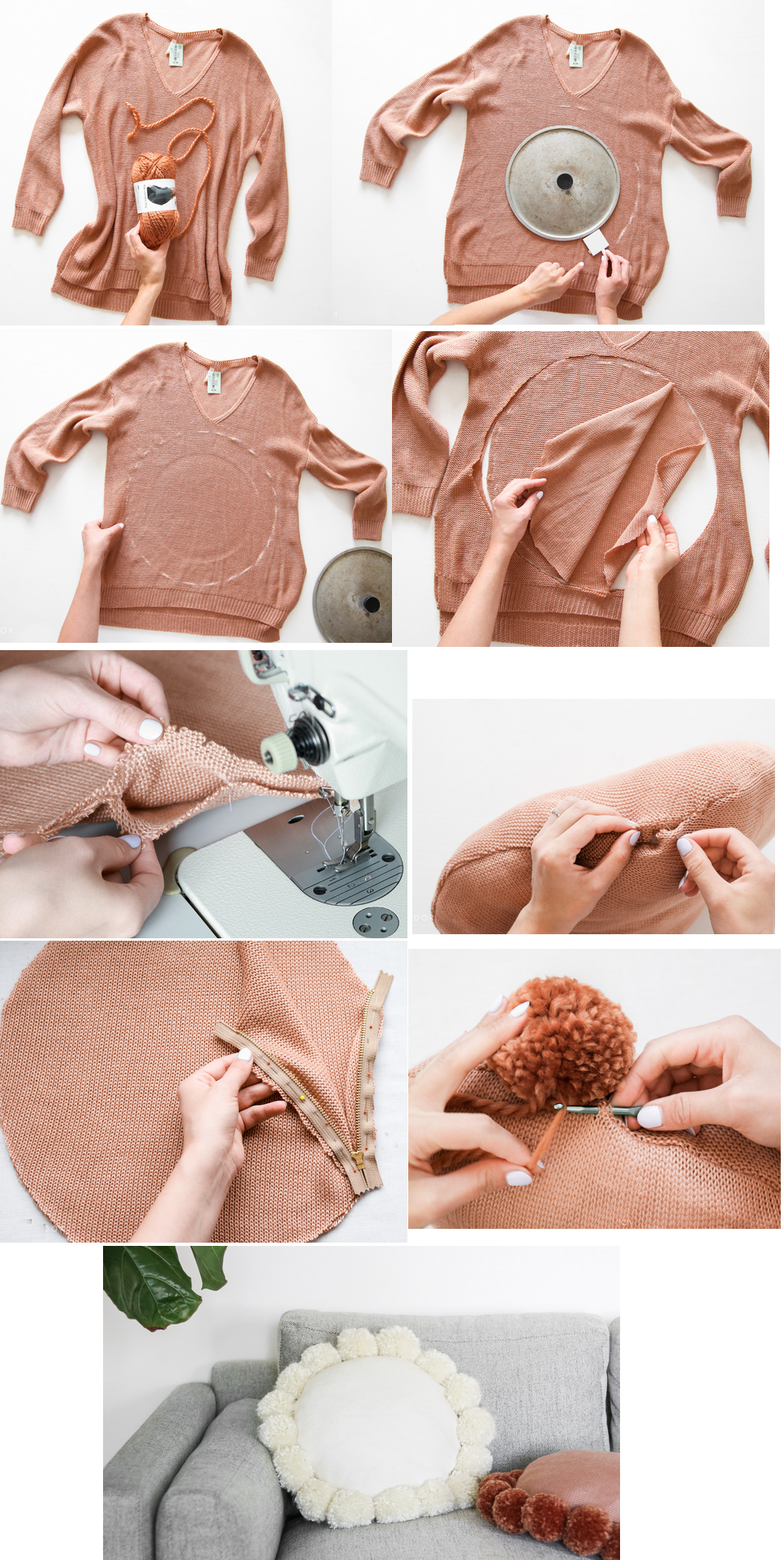Tejer con aguja de ganchillo o crochet o coser a mano cada pom pom en todo el perimetro del almohadon.